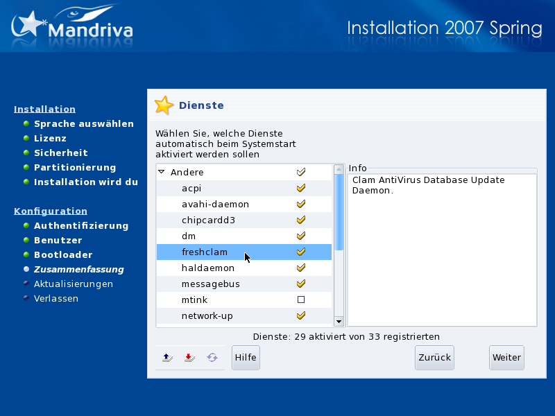 Dienste: Sie können hier die Dienste wählen, die ab dem Start von Mandriva Linux zur Verfügung gestellt werden sollen. Wollen Sie den Rechner als Server verwenden, sollten Sie unbedingt einen Blick auf diese Liste werfen.