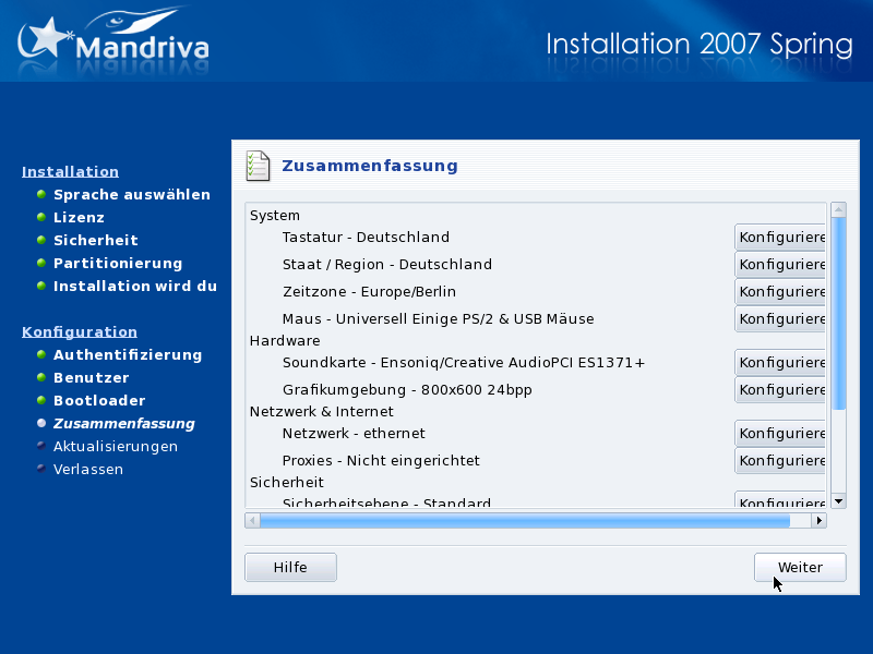 Zum Abschluss zeigt Ihnen DrakX eine Zusammenfassung verschiedener Informationen Ihres Systems. Je nach vorhandener Hardware sehen Sie hier einige oder alle der folgenden Einträge. Jeder dieser Einträge besteht aus einem konfigurierbaren Gerät, gefolgt von dessen aktuellem Zustand. Durch Betätigen der entsprechenden Schaltfläche können Sie Änderungen daran vornehmen.