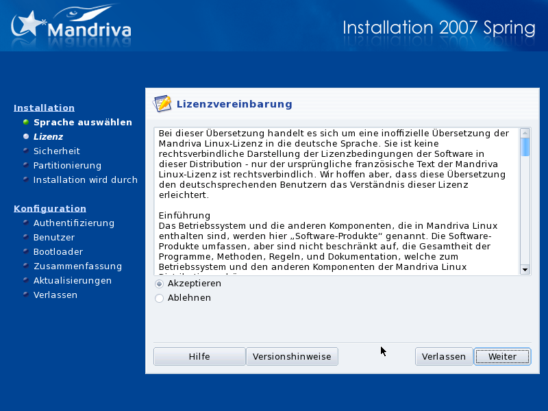Bevor Sie fortfahren, sollten Sie die Lizenzbedingungen aufmerksam lesen. Sie gelten für die gesamte Mandriva Linux Distribution. Stimmen Sie in allen enthaltenen Punkten zu, so markieren Sie die Option Akzeptieren und klicken anschließend auf . Sollten Sie nicht in allen Punkten zustimmen können, betätigen Sie bitte die Schaltfläche . Danach führt der Computer einen Neustart durch.