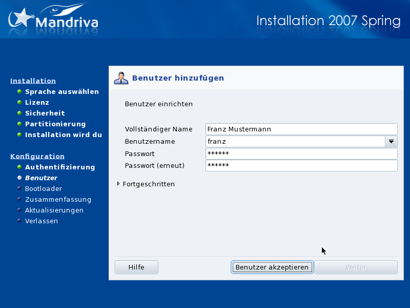 Legen Sie mindestens ein Benutzerkonto an. Zuerst geben Sie bitte