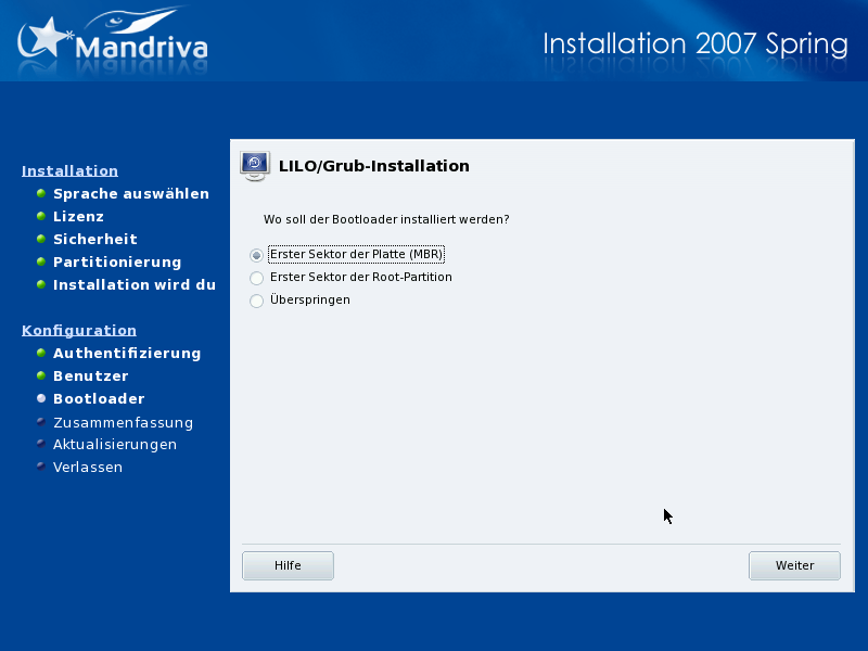In allen anderen Fällen werden Sie gefragt, wohin der Bootloader installiert werden soll. Im Allgemeinen ist das im Ersten Sektor der Platte (MBR).