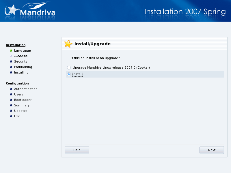 DrakX now needs to know if you want to install from scratch or to upgrade your existing Mandriva Linux system: