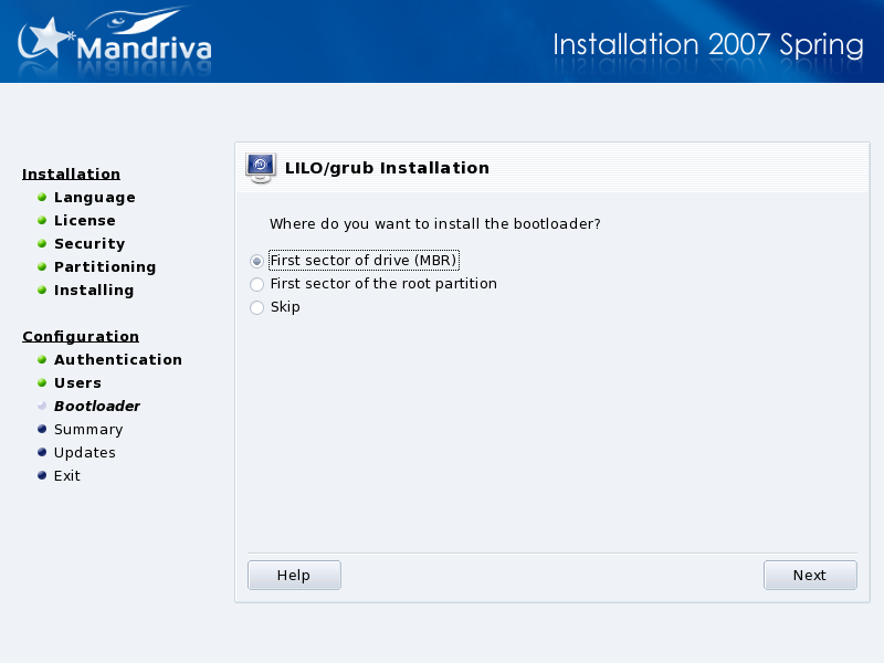A bootloader is a small program which is started by the computer at boot time. It's responsible for starting up the whole system. Normally, the bootloader installation is totally automated. DrakX analyzes the disk boot sector and acts according to what it finds: