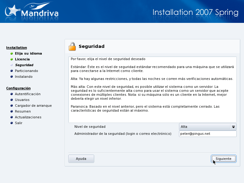 En este punto DrakX le permite elegir el nivel de seguridad que desea para su máquina. Como regla general, el nivel de seguridad debería ser mayor si la máquina va a contener datos cruciales, si estará expuesta directamente a Internet, o si albergará a muchos usuarios. No obstante, un nivel de seguridad más alto generalmente se obtiene a expensas de la facilidad de uso.