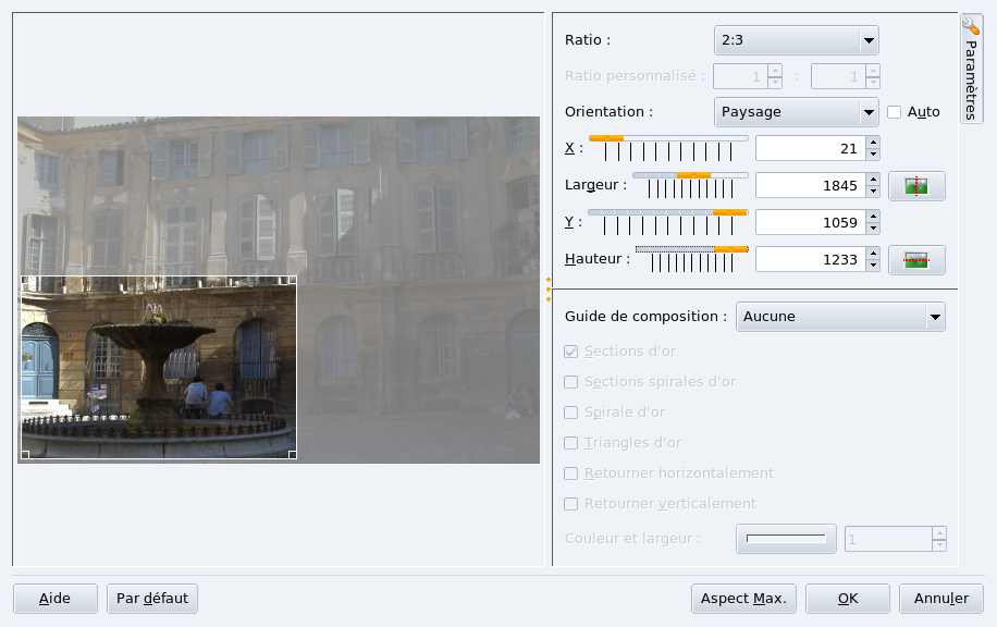 Vous pouvez aussi redimensionner une image à une taille voulue en gardant l'aspect ratio. Choisissez → depuis le menu, glissez le carré pour cadrer la partie de l'image qui vous intéresse, et sélectionnez l'aspect ratio, l'orientation, la largeur et la hauteur : ces éléments se suivent selon l'aspect ration choisi.