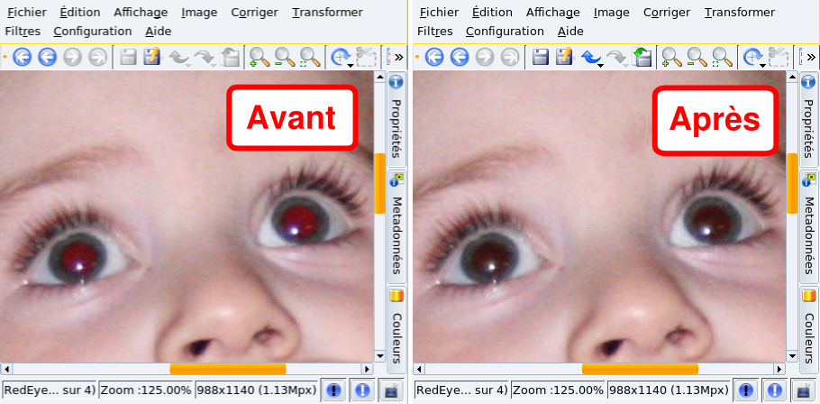 Sélectionnez à l'aide de la souris la pupille de l'œil à corriger, choisissez → dans le menu, puis choisissez une option de correction suivant les indications données. Répétez l'opération pour chaque œil.