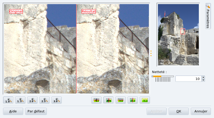 Choisissez → , déplacez le pointeur sur la partie de l'image à utiliser comme guide, et utilisez le curseur pour modifier la netteté de l'image.