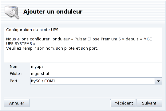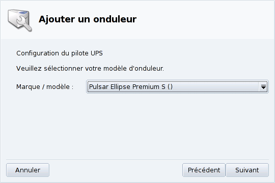 Installation Automatique. Ouvrez le Centre de contrôle Mandriva Linux, puis la catégorie Matériel et cliquez sur Configurer un onduleur (UPS) pour la surveillance du courant électrique pour lancer DrakUPS. Cochez l'option Connecté via un port série ou un câble USB pour laisser DrakUPS détecter automatiquement votre UPS.