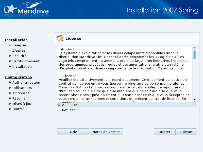 Avant d'aller plus loin, il est fortement recommandé de lire attentivement les termes et conditions d'utilisation de la licence. Celle-ci régit l'ensemble de la distribution Mandriva Linux. Si vous en acceptez tous les termes, cochez la case Accepter puis cliquez sur Suivant. Sinon, cliquez sur le bouton pour redémarrer votre ordinateur.
