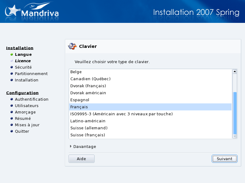 Selon la langue principale que vous avez choisie précédemment (voir Section 2, « Choix de la langue »), DrakX sélectionnera le clavier approprié. Vérifiez que cela correspond effectivement à votre configuration de clavier ou choisissez une autre configuration dans la liste.