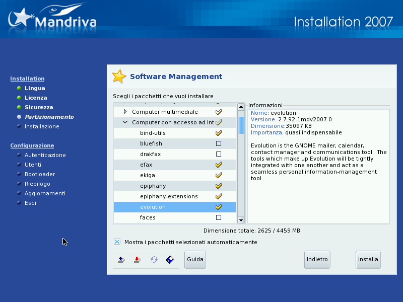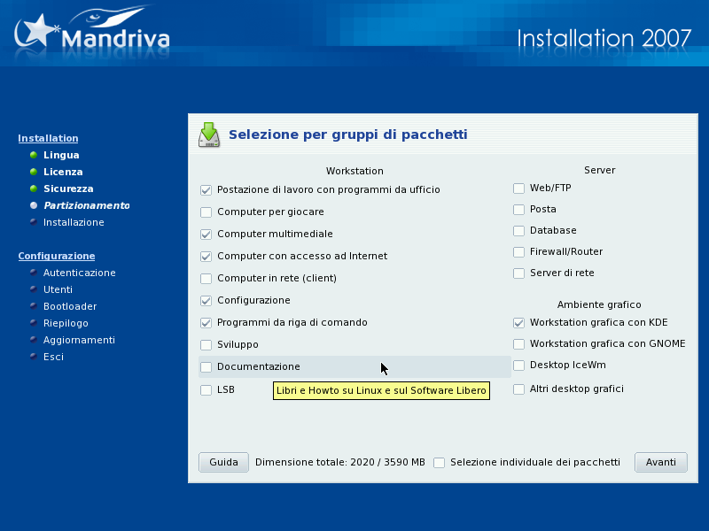 Adesso è il momento di indicare i programmi che volete installare sul vostro sistema. Ci sono migliaia di pacchetti disponibili per Mandriva Linux, e sono stati suddivisi in gruppi in base al loro campo di utilizzo, in modo da facilitarne la gestione.