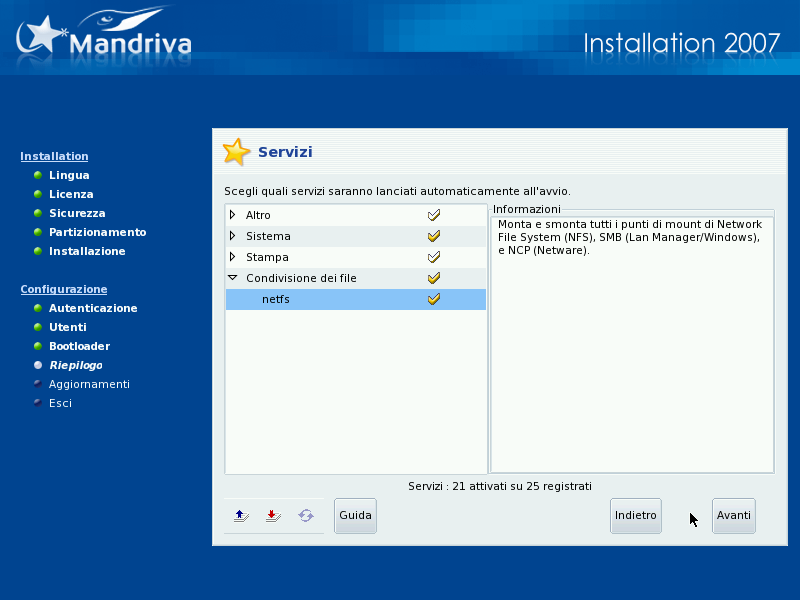 Servizi: qui potrete stabilire in dettaglio quali servizi saranno attivati sul vostro sistema. Se pensate di utilizzare il computer come server, è senz'altro una buona idea controllare queste impostazioni.