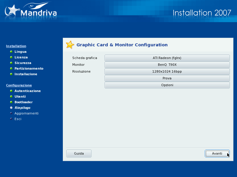 Qui potete scegliere risoluzione e profondità di colore tra quelle disponibili per il vostro hardware. Scegliete le impostazioni che meglio si adattano alle vostre necessità (potrete cambiare la configurazione anche dopo l'installazione, comunque). All'interno dell'immagine del monitor è rappresentato un esempio della configurazione selezionata.