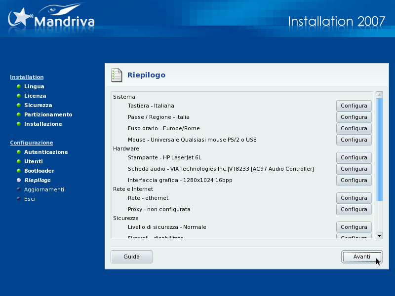 A questo punto DrakX mostrerà un riassunto di varie informazioni che ha raccolto riguardo al vostro sistema. In base all'hardware installato, potrebbero essere visualizzate tutte le voci che descriveremo tra poco, o solo alcune di esse. Ogni voce riporta il nome di un componente hardware che può essere configurato, con accanto una breve sintesi della configurazione attuale; cliccate sul pulsante corrispondente per cambiarla.