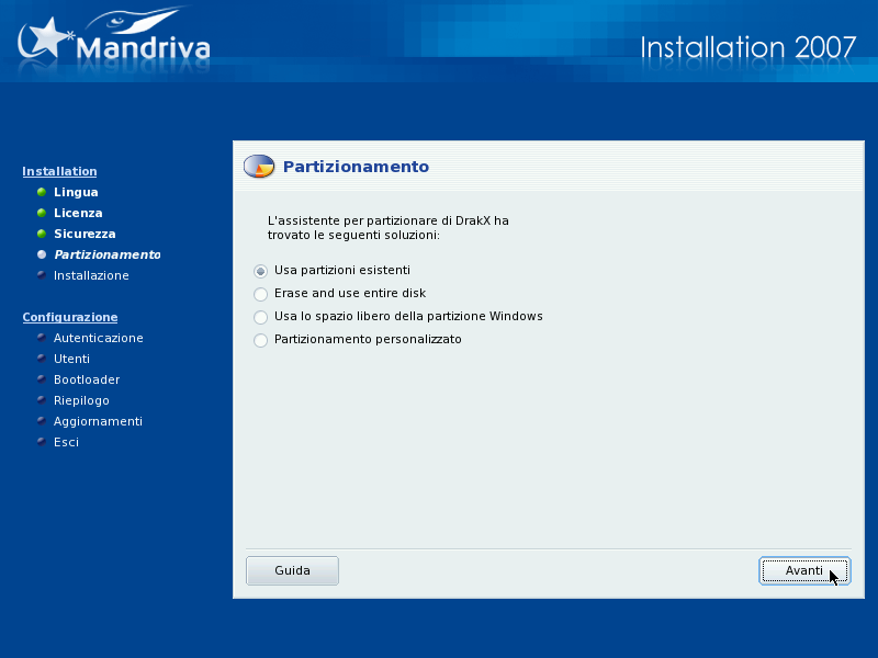 A questo punto dovete scegliere in quale parte del vostro disco rigido installare Mandriva Linux. Il disco deve essere diviso in partizioni; questa operazione («partizionamento») consiste nel suddividerlo logicamente in più zone, in maniera da creare lo spazio necessario all'installazione di Mandriva Linux.