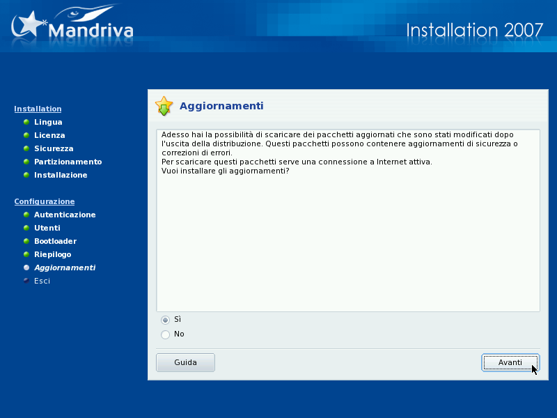 È probabile che, al momento in cui installate Mandriva Linux, alcuni pacchetti siano stati aggiornati rispetto alla versione iniziale; potrebbero essere stati corretti degli errori, o risolti eventuali problemi relativi alla sicurezza.