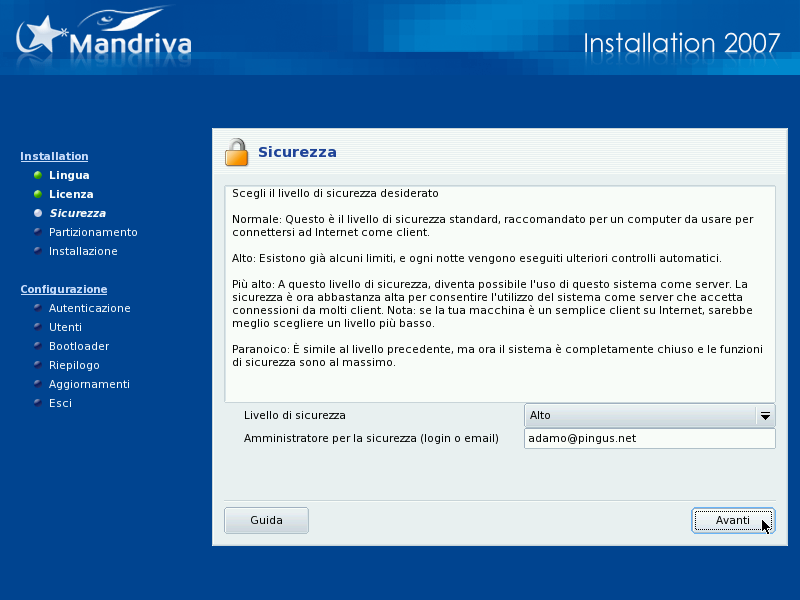 A questo punto, DrakX vi permette di scegliere il livello di sicurezza da impostare sul sistema; come regola generale, quanto più la macchina sarà esposta a Internet e quanto più sono importanti i dati che essa dovrà contenere, tanto più alto dovrebbe essere tale livello. Tenete presente, tuttavia, che a un livello di sicurezza più alto corrisponde in genere una minore facilità d'uso.